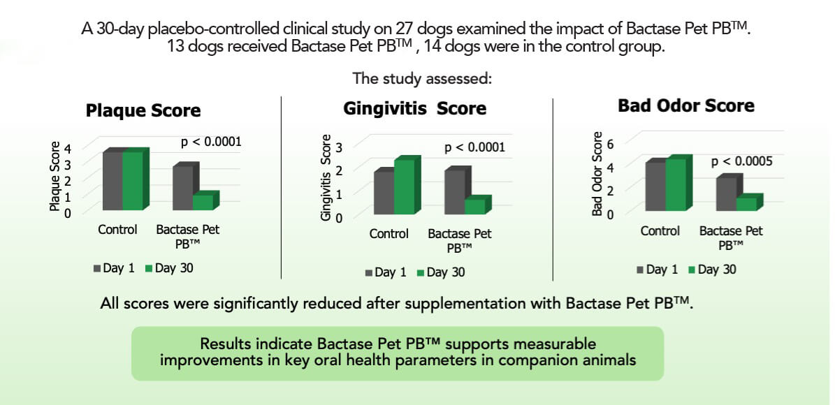 Bactase Pet PB™ was evaluated in a recently published peer-reviewed 30-day randomized, double-blind, placebo-controlled clinical trial in dogs receiving twice-daily supplementation. Results showed up to 67% reduction in plaque buildup, gingivitis and bad breath.*
